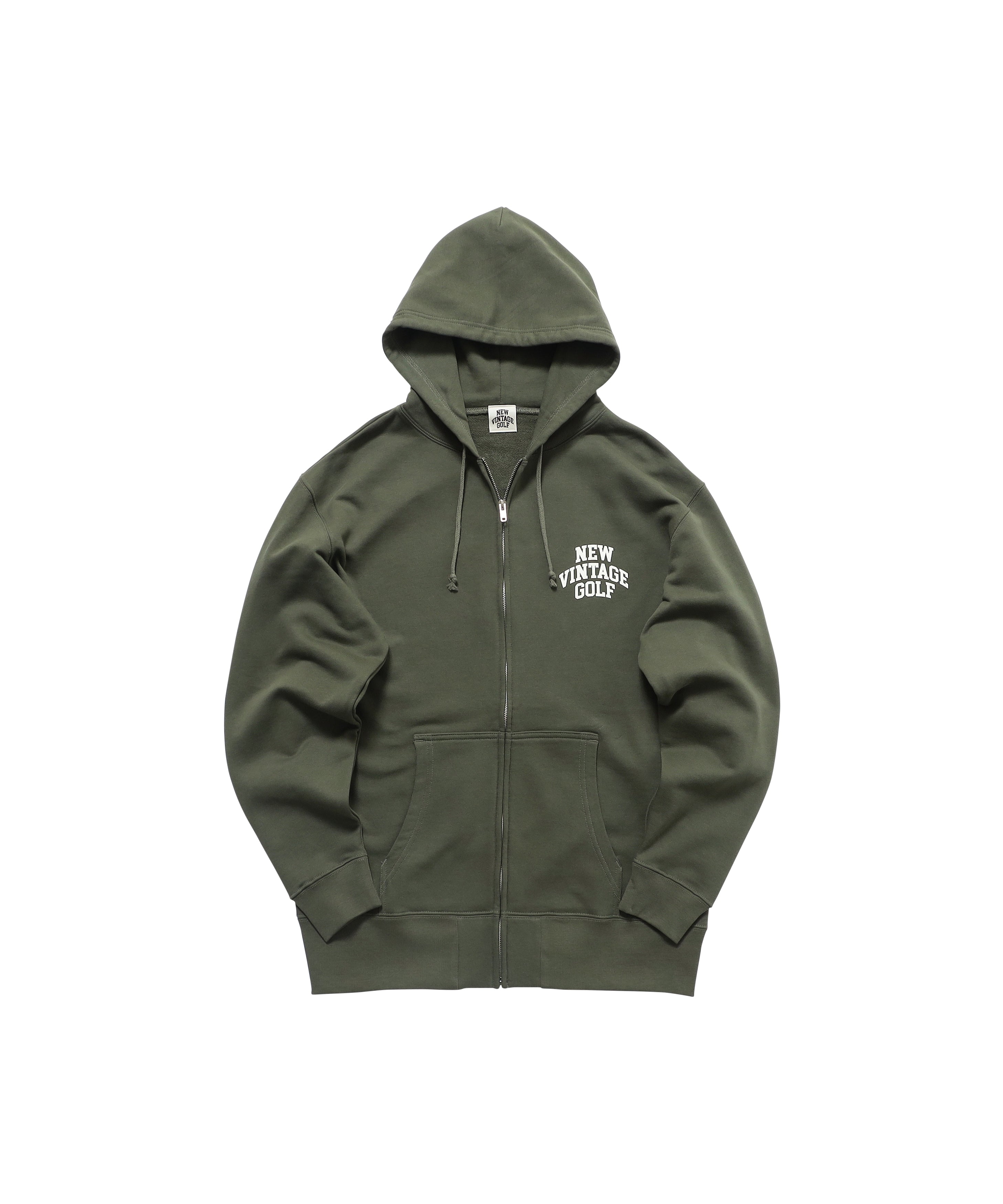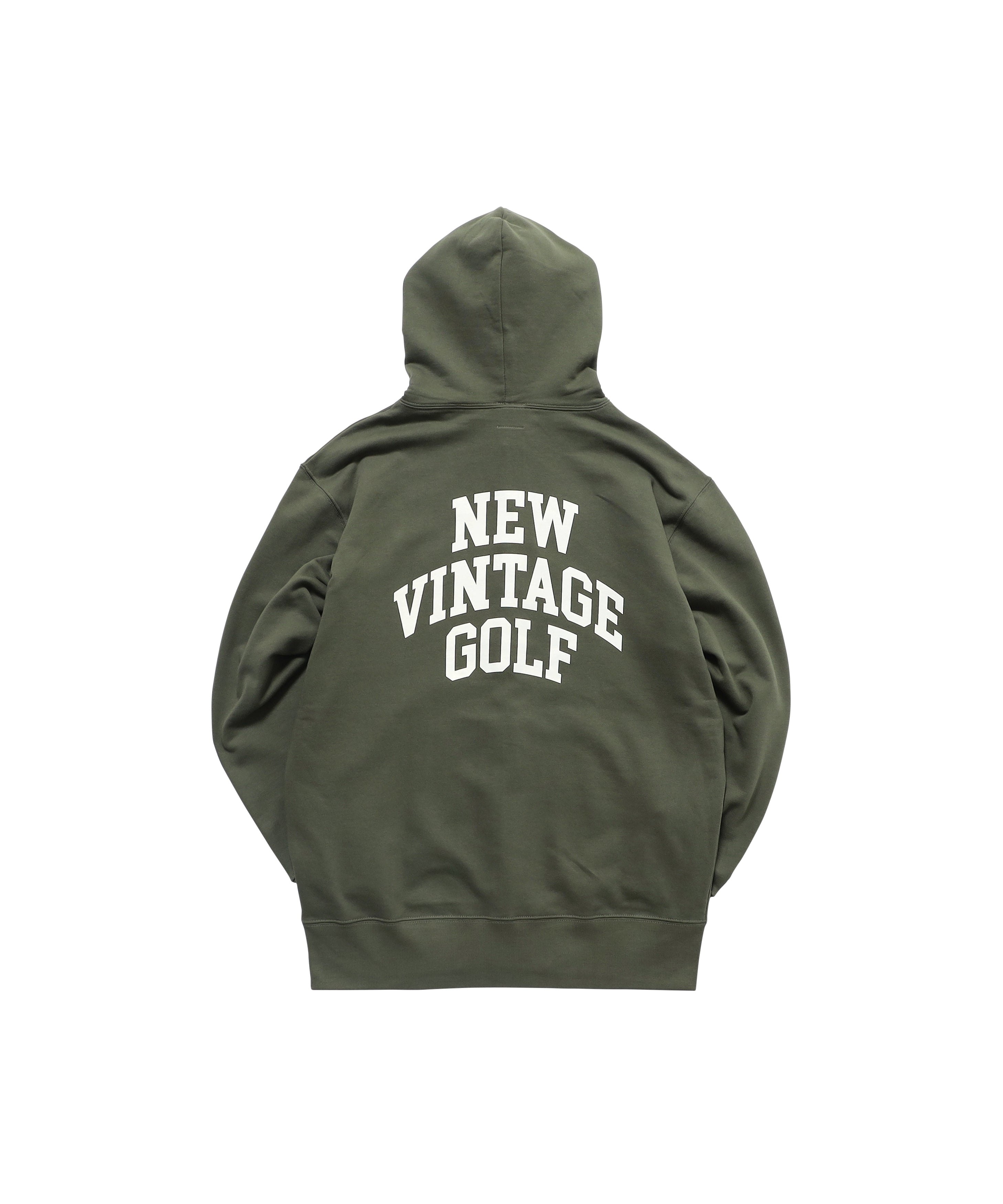 NEW VINTAGE GOLFの3段アーチロゴを前後にプリントしたフルジップスウェットフーディです。